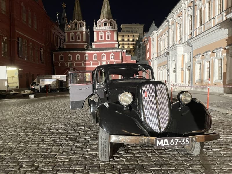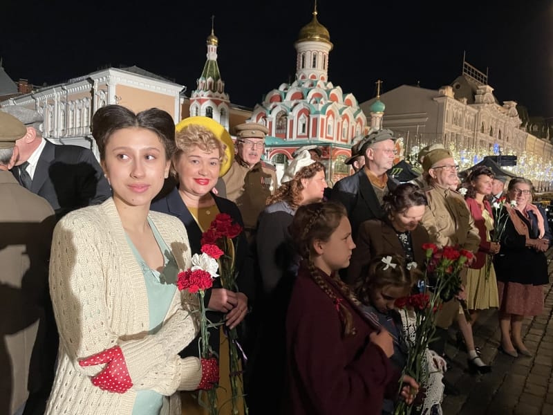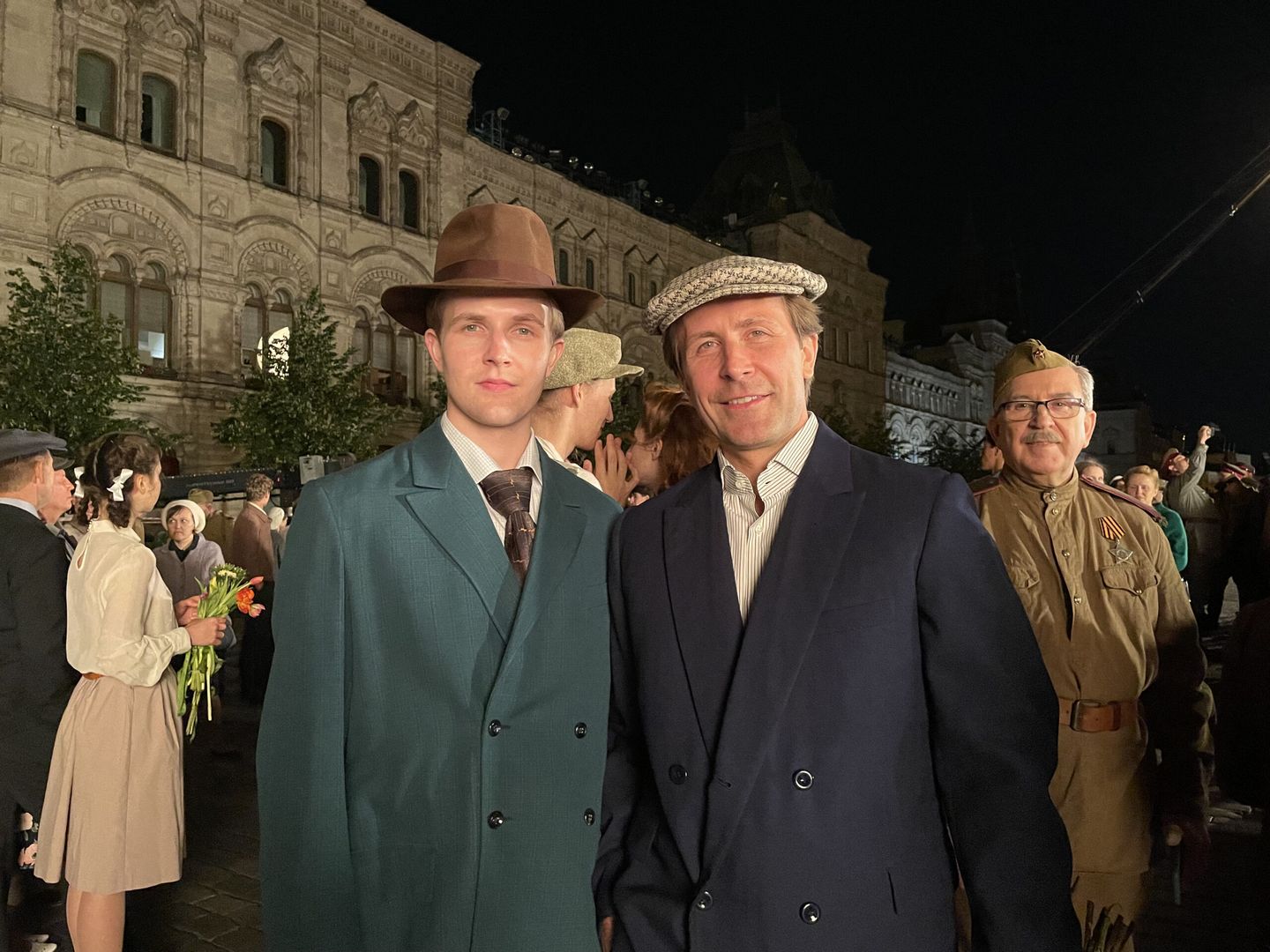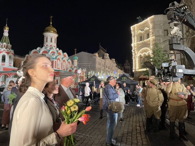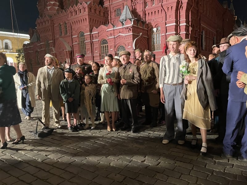 Московская ночь, мчат такси вдоль набережных, где прогуливается молодежь, городская подсветка создает «киношное» настроение, предвкушение чего-то волшебного. Прямо перед Храмом Василия Блаженного раскинулся целый город из автобусов и трейлеров. Достаточно нырнуть под заградительную ленту, как сразу оказываешься в другой эпохе. Костюмы актеров – времен Великой Отечественной войны. Словно два времени соединились, когда видишь солдата в шинели со смартфоном или уплетающего треску из пластиковой тарелки. Костюмы актеров можно рассматривать бесконечно: платья выдержаны в спокойных тонах, все разные – белые, голубые, в крупный и мелкий горох. У мужчин в основном военная форма, но встречаются парни в костюмах и шляпах. Ткани очень качественные, настоящие. Видно, что девочкам из массовки нравятся их наряды, а банты, вплетенные в косы, подчеркивают праздничный образ, ведь сегодня снимают финальную сцену, когда все радуются Победе на Красной площади!