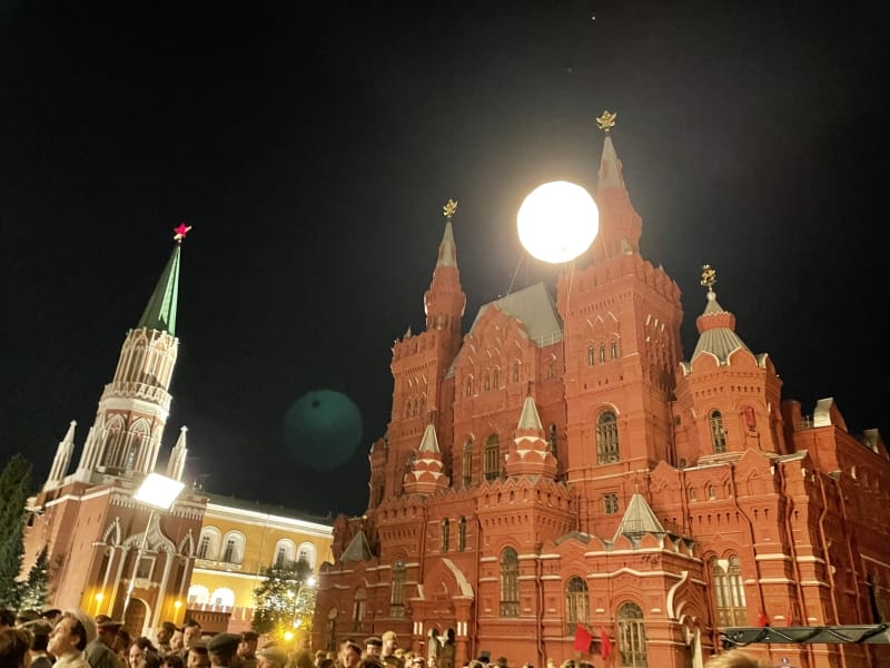 Около 200 человек массовки выдвинулись на съемочную площадку. По брусчатке ночной, полностью перекрытой Красной площади стучат каблучками женщины, уверенно шагают обутые в сапоги мужчины. Все это сливается в единый звук, одновременно и жутковатый, и завораживающий. Актеры буквально вжились в свои роли, и это дает ощущение, что я тоже нахожусь в том времени, радостном от Победы и горьком от потерь. У Исторического музея уже подготовлена съемочная площадка, издалека видны большие светящиеся шары, парящие над площадью, попеременно вспыхивающие и угасающие. Позже мне объяснили, что шары имитируют салют. Кстати, в массовке участвовал и сам генеральный продюсер картины. Громкий женский голос скомандовал народу строиться, режиссер Кирилл Белевич объяснил актерам, что нужно делать в кадре: ходить, радоваться и обниматься. Вдруг над площадкой появилась, словно инопланетный пришелец, большая видеокамера. Женщинам раздали романтичные тюльпаны, мужчинам – сдержанные гвоздики. Торопливо засуетились киносъемщики с рациями, все было готово к репетиции. Откуда-то прозвучал голос из мегафона: «Репетиция, начали!» И площадка погрузилась в дух того времени, мужчины обнимались и пели песни, женщины плакали от счастья и целовали детей, молодые девушки с улыбкой проходили с цветами сквозь толпу. Все жили в кадре, жили той Победой, одной на всех, без срока давности.