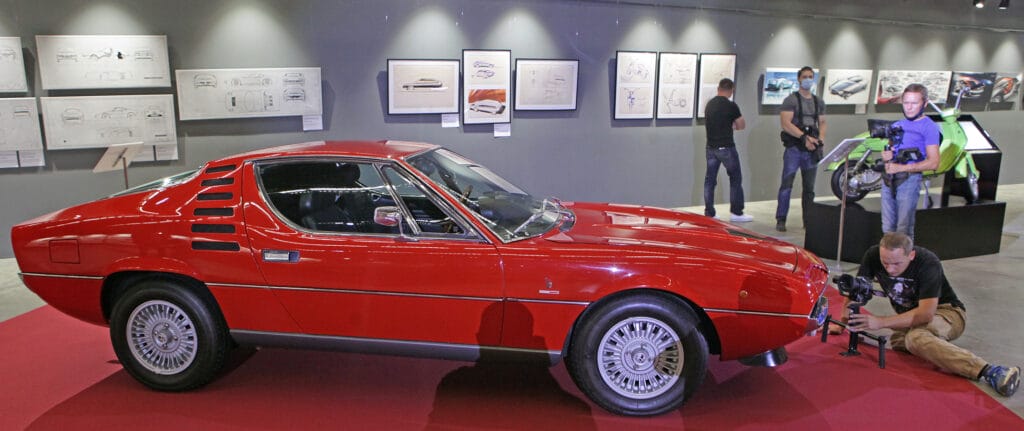Экспозиция также включает ряд рисунков и фотографий, предоставленных Государственным архивом Италии и историческим архивом Bertone, например, наброски, сопровождавшие новые модели на презентациях, и проектные чертежи. Есть и несколько экспонатов, связанных с автоспортивными мероприятиями, для участия в которых ателье Bertone подготовило несколько успешнейших моделей, включая легендарную Lancia Stratos. За внешним лоском и громким именем многих марок лежит тяжелый труд механиков и дизайнеров, который позволил в острой конкуренции совершенствовать выпускаемые машины, и всегда итальянским мастерам помогала особенная любовь к прекрасному, в том числе, и в автомобилестроении.