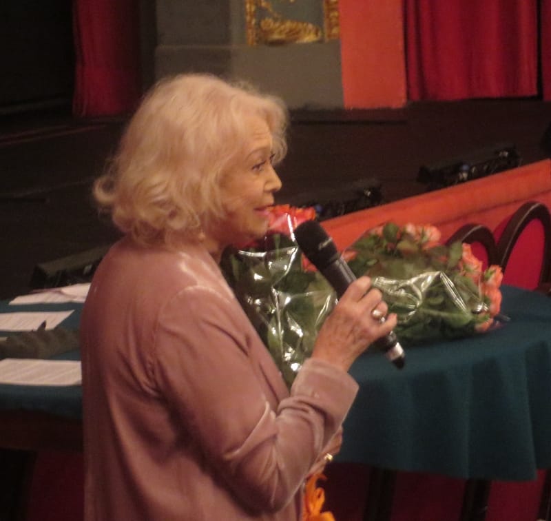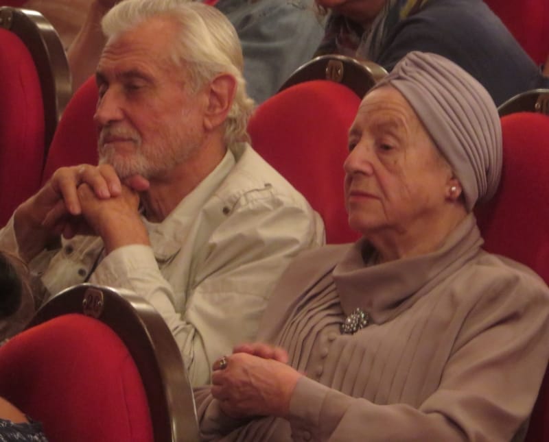 Народная артистка России Евгения Симонова под громогласные овации зала поздравила с 60-летием работы в театре заслуженную артистку России Майю Полянскую.