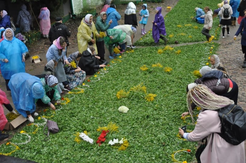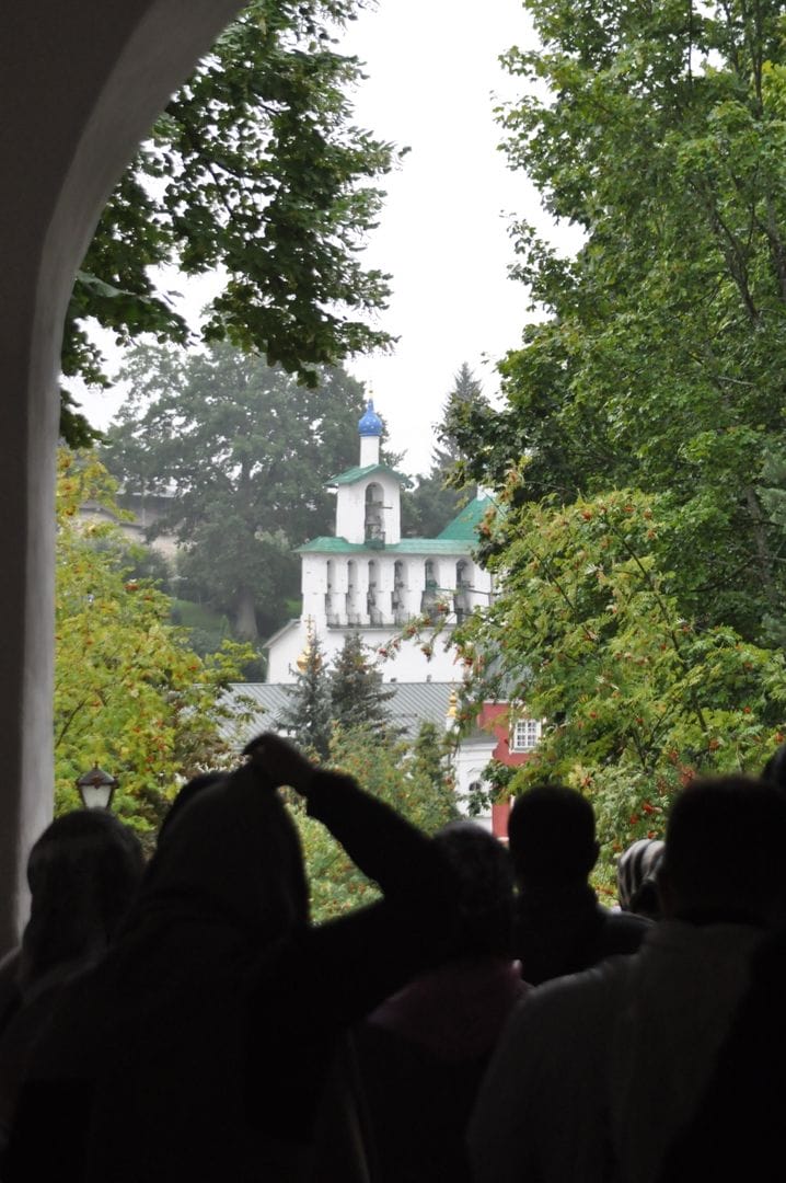 Знакомство с достопримечательностями Псковской области началось с Псково-Печерского Свято-Успенского монастыря. Он уникален тем, что никогда не закрывался и в нем никогда не прекращалось богослужение. Территория монастыря огромна, правда, гид объяснил, что мы не сможем посетить большую часть храмов на территории, так как все готовятся к празднику Успения. И ходить нам приходилось с осторожностью, поскольку по традиции дорогу от Никольских ворот до Успенского собора устилают к этому празднику живыми цветами.