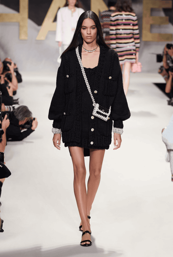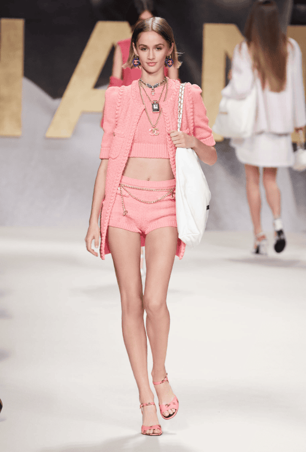 В новой коллекции три лейтмотива: традиционный для модного дома твид, кожа и, все больше укрепляющий свои позиции в современной моде, латекс. На прицеле грядущего теплого сезона: мини-юбки, велосипедки, пиджаки оверсайз и костюмы в стиле 1960-х. Классическая черно-белая тема в коллекции разбавлена яркими оттенками лета, особенно розовым, ну а темный шифон с цветными бабочками стал завершающей темой показа будущего весенне-летнего сезона.