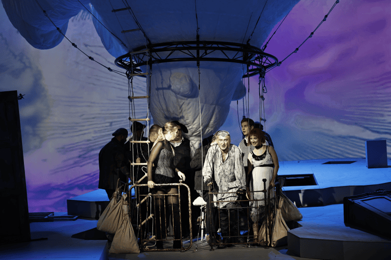 Апофеозом становится совместный полет на воздушном шаре. Такого в этом театре еще видеть не доводилось! Громадное сооружение взметается в высь, и его пассажиры уверены, что вместе с бароном могут оказаться на Марсе, Юпитере, но… у всякой фантазии, увы, конец предсказуем. В финале барон умирает и его душа становится Чайкой. А родня и друзья успешно торгуют его историями. Все продается и покупается. Это уже наш век, наши реалии, наш менталитет…