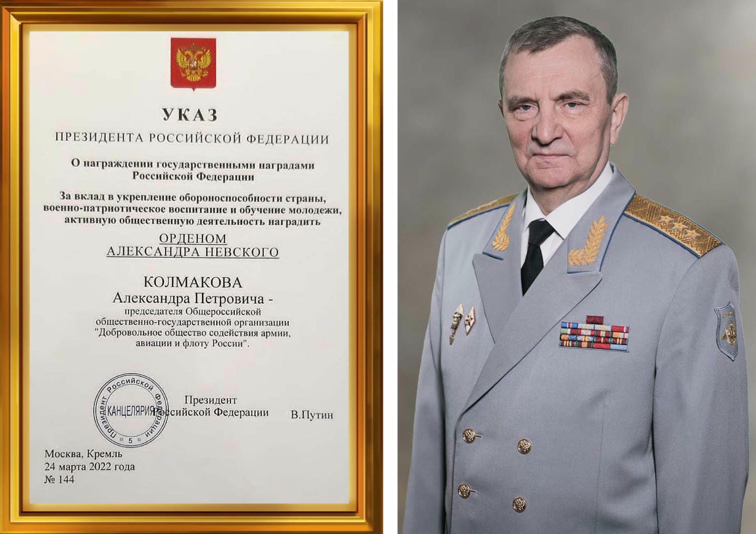 Указом Президента Российской Федерации председатель ДОСААФ России генерал-полковник Александр Петрович Колмаков за вклад в укрепление обороноспособности страны, военно-патриотическое воспитание и обучение молодежи, активную общественную деятельность награжден орденом Александра Невского.