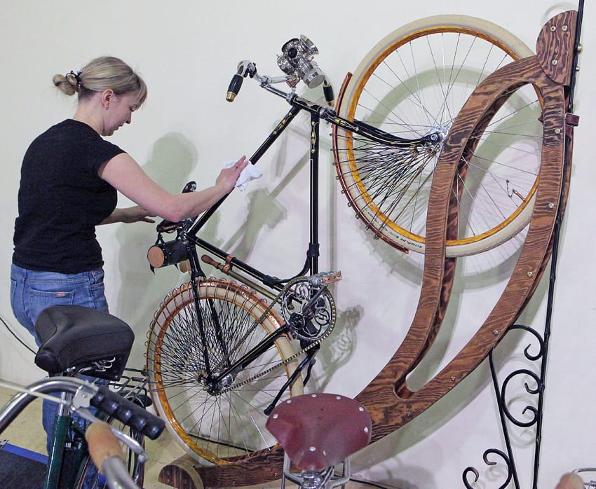 Не только дизайнерские мотокони, но и настоящая живая история украшала стенды. Вот легендарный мотоцикл ХМЗ, или советский «Харлей». Это первый четырехтактный мотоцикл времен СССР, который выпускали серийно. Его создали в Харькове, используя в качестве образца тогдашний Harley-Davidson Model B. В 1931-32 годах сделали небольшую партию и до сих пор эти мотоциклы считались полностью утраченными. На выставке показали единственный сохранившийся экземпляр. Байк отыскал и восстановил коллекционер Евгений Шаманский. Реставраторы собирали детали на протяжении десяти лет! Найти удалось почти всё, а что не отыскали — изготовили по технологиям 1930-х годов. Вся работа заняла полтора года. Специалисты подчеркивают: мы занимаемся научной реставрацией, у нас полный оригинал. Даже течь масла из мотора — оригинальная, так и должно быть, тут нет сальников, они не предусмотрены конструкцией.