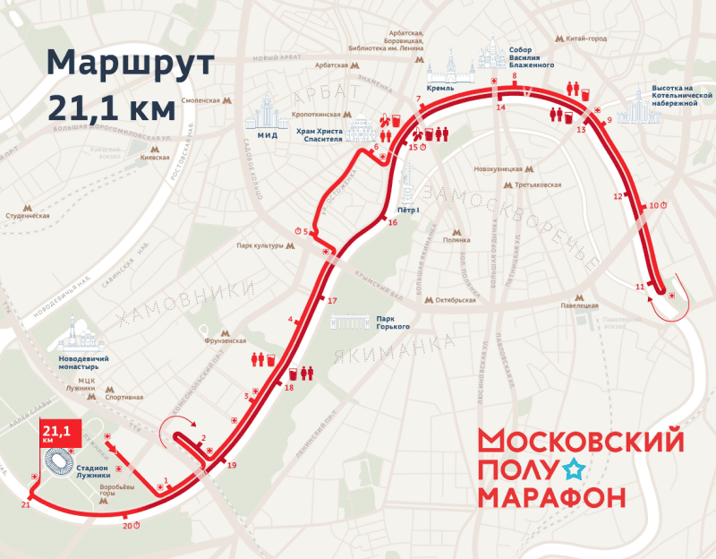 По мере продвижения участников марафона последует перекрытие Кремлевской набережной в период 08.10 – 12.00 на участке: улица Ленивка – Большой Москворецкий мост. С 08.20 до 12.00 нельзя будет проехать по Москворецкой набережной от Москворецкой улицы до Большого Устьинского моста. Устьинскую набережную закроют для автотранспорта с 08.30 до 12.00.