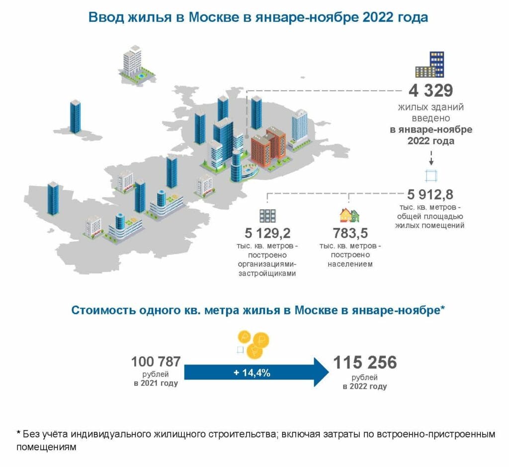 Если не учитывать частное жилищное строительство, то средняя стоимость одного квадратного метра общей площади жилых домов в столице для застройщиков составила 115 256 рублей. Эта сумма включает затраты по всем помещениям, в том числе по пристройкам.