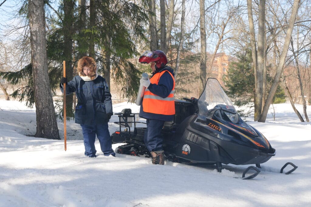 Водосборная территория немаленькая: 1010 кв. км. По талому снегу мчится снегоход «Тайга». На «Тайге» двое: оператор запорных сооружений Николай Журавлев и инженер-гидролог Анастасия Носкова. Девушка вооружена длинной рейкой для измерения высоты снега и специальными весами. «Тайга» останавливается, инженер-гидролог втыкает рейку в снег, отмечает его высоту. Затем набирает столбик снега в весы и взвешивает – таким образом рассчитывается его плотность.