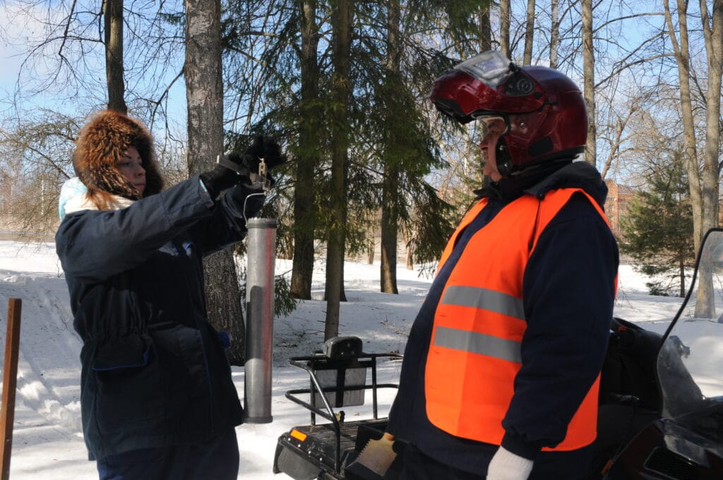 – У нас есть ежегодный постоянный маршрут, на котором мы измеряем высоту снежного покрова и его плотность в одних и тех же точках, – рассказывает Анастасия. – Периодичность – раз в десять дней в зимний период и один раз в пять дней с началом наступления снеготаяния. В поле контрольные точки расположены через каждые 150 метров, в лесу – через каждые 100 метров.