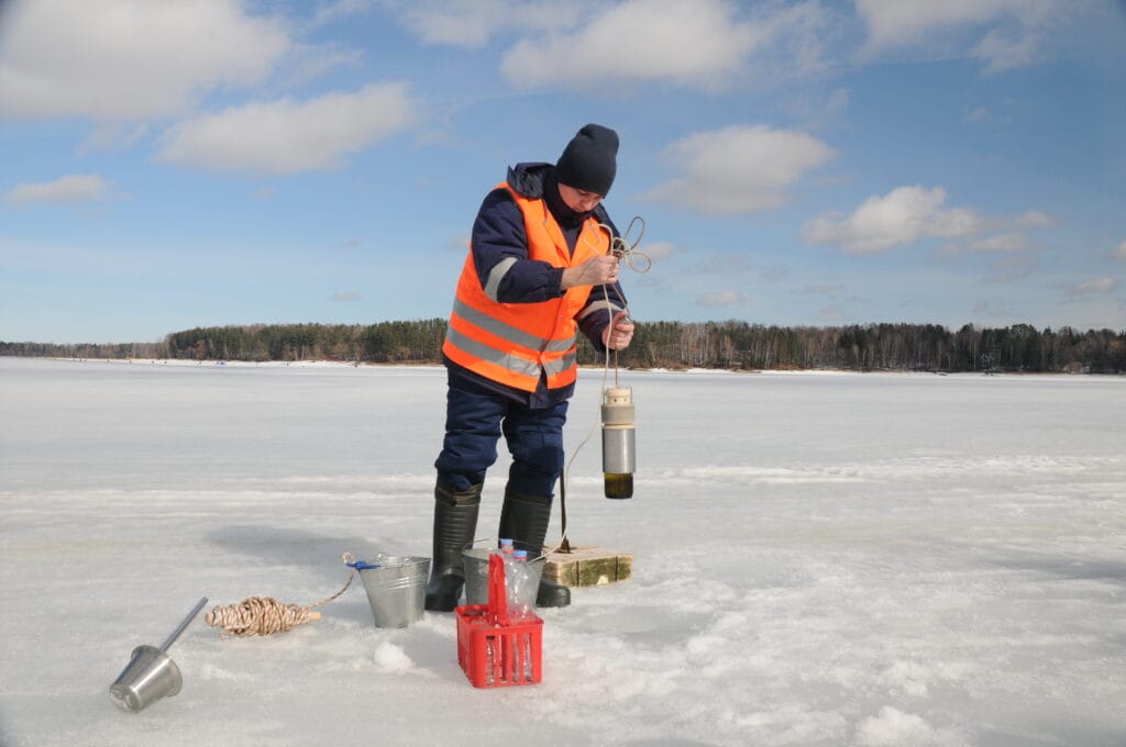 Зимой воду берут из лунки в приплотинной зоне. График такой же, как и с измерением толщины и плотности снежного покрова, – раз в десять дней. А вот с наступлением плюсовых температур и началом снеготаяния пробы воды отбираются каждый день. Потому что в половодье свойства воды могут изменяться ежедневно. В реку стекает вода с дорог, полей. Вода течет с ферм, автобаз, со строек, с жилых поселков – да мало ли откуда!