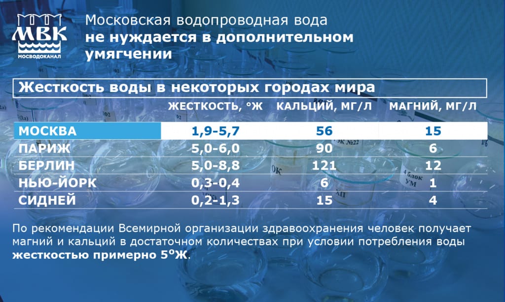 Московской воде дополнительное фильтрование не нужно – содержание в ней магния и кальция безвредно и для человека, и для техники», – поясняет главный технолог управления водоснабжения АО «Мосводоканал» Елена Столярова.