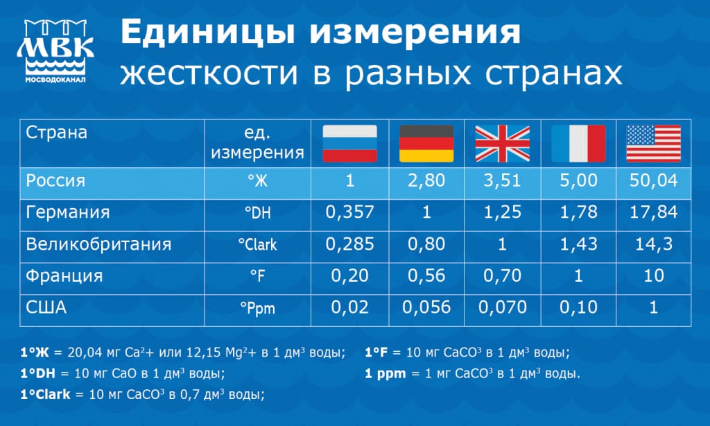По словам Андрея Смирнова, директора Западной станции водоподготовки АО «Мосводоканал», таблица очень простая и понятная: «Любой человек может спокойно пересчитать из представленных российских нормативов в иностранные и выставить на бытовой технике определенную жесткость, в соответствии с которой она будет дозировать средства для смягчения воды. Благодаря этому можно продлить срок ее службы, предотвратив образование накипи и прочих отложений».