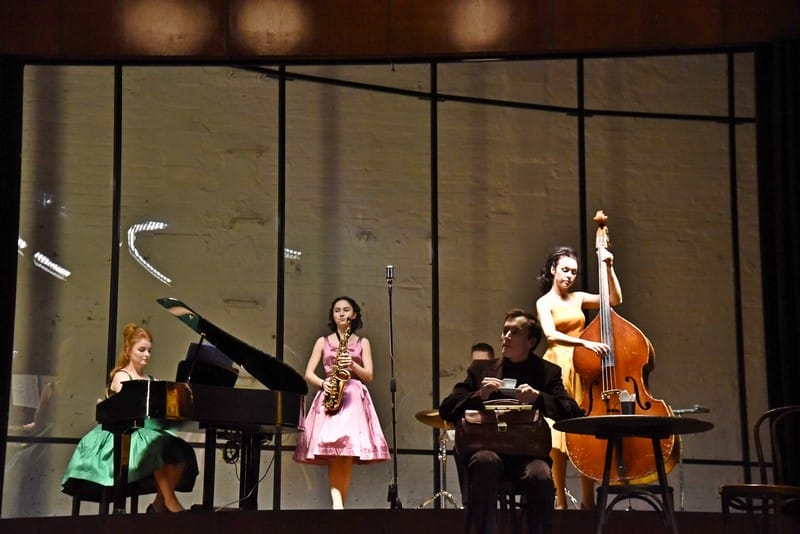 Но есть и успехи (помимо декораций и костюмов) – это потрясающе эмоционально-музыкальный молодежный джаз (Екатерина Варкова, Юлия Стожарова, Александра Хованская, Иван Лоскутов), великолепная игра «сценарием сюжета» поэта (Сергей Кирпичёнок), а также талантливое воплощение нескольких ролей сразу Дмитрием Муляром. Его Семёнову, отчиму главного героя, сторожу из зоопарка и человеку с георгином, веришь, потому что он играет, а не бездушно «исполняет» роль.