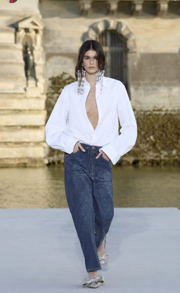 Креативный директор Дома Valentino Пьерпаоло Пиччоли выбрал для своего показа французский замок Шато-де-Шантийи. Акцентами в новой коллекции стали балетки с узкими мысами и огромными бантами, а также массивные висячие серьги-люстры. Интересно, что первый же выход топ-модели Кендалл Дженнер в джинсах и блузке на самом деле представлял собой выход в брюках из редкой ткани, шелкового газара (особой смеси шелка и шерсти), полностью расшитых мельчайшим перламутровым бисером и окрашенных в 80 оттенков индиго, чтобы получить внешнее сходство с привычной нам «джинсой». Уже примерно представляете, в какую кругленькую сумму могут вылиться такие штанишки?