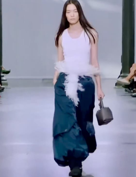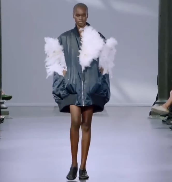 Тема перьев хоть и давно кочует из сезона в сезон и из коллекции в коллекцию, пока так и нашла своего места в повседневной одежде. Помочь перьям адаптироваться взялся автор сумок в виде голубя и лягушки, дизайнер Джонатан Уильям Андерсон. В частности, он пристроил их в швы огромного бомбера и использовал в качестве пояса к брюкам карго.