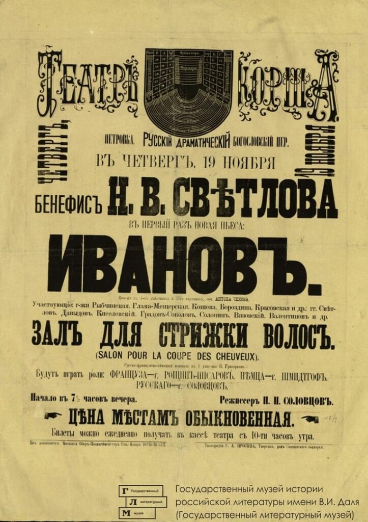 19 ноября 1887 года в Москве в русском драматическом театре Корша состоялась премьера спектакля по пьесе Антона Павловича Чехова «Иванов». Первый театральный опыт очень сильно повлиял на отношение писателя к театру.