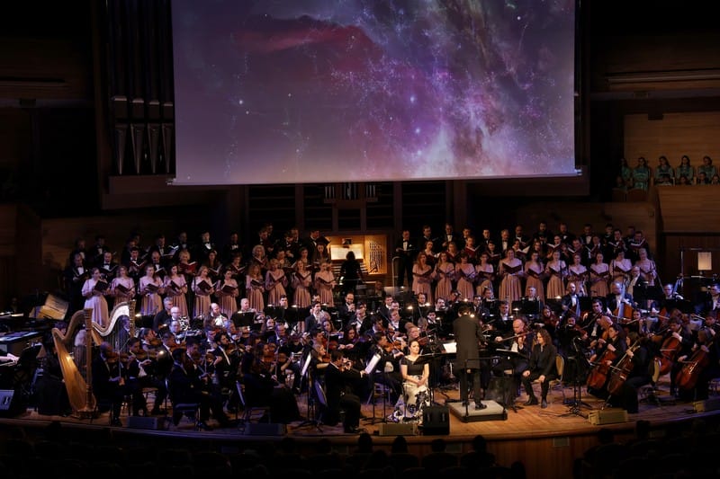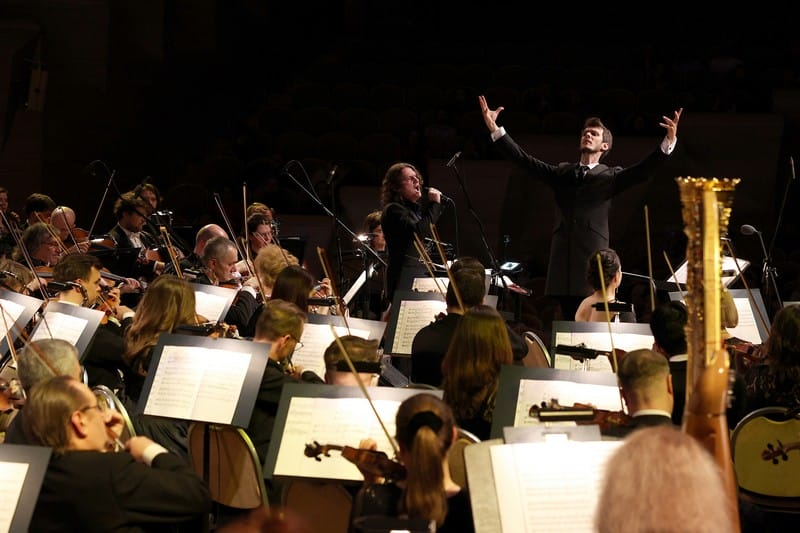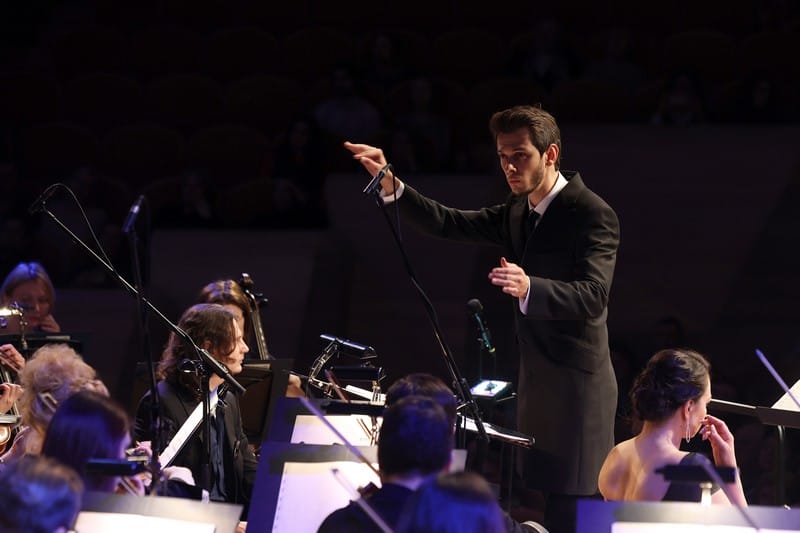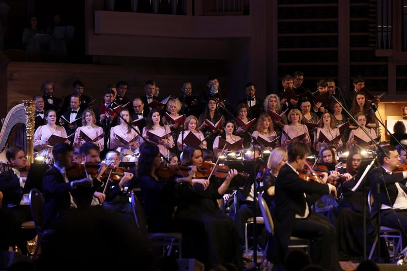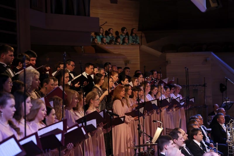 На сцене: Академический симфонический оркестр Московской филармонии, Государственная капелла Москвы имени Вадима Судакова, детский хор «Весна» имени А. С. Пономарева. Дирижер – Тимофей Гольберг.