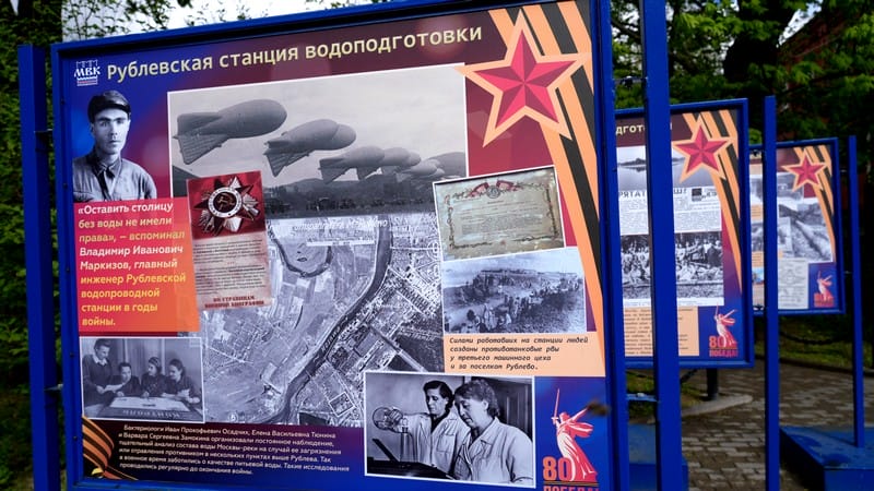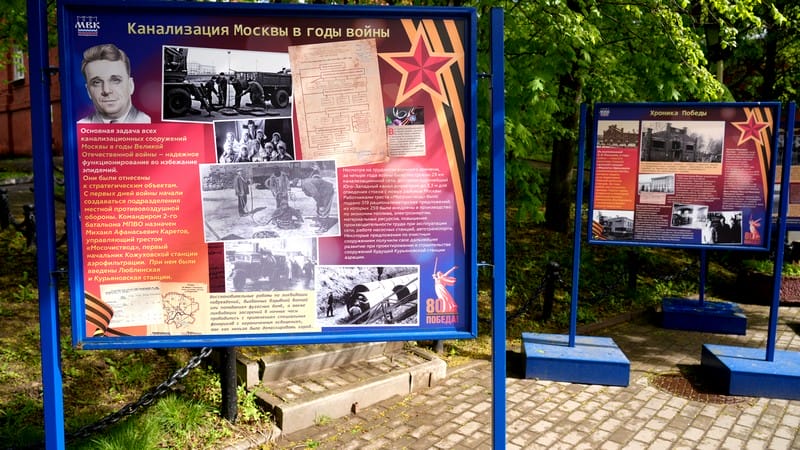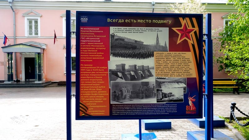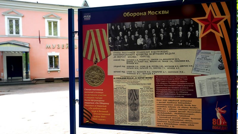 Одним из событий, связанных с 80-летием Победы в Великой Отечественной войне, в АО «Мосводоканал» стала уличная фотовыставка, открытая возле Музея воды АО «Мосводоканал» в Саринском проезде.