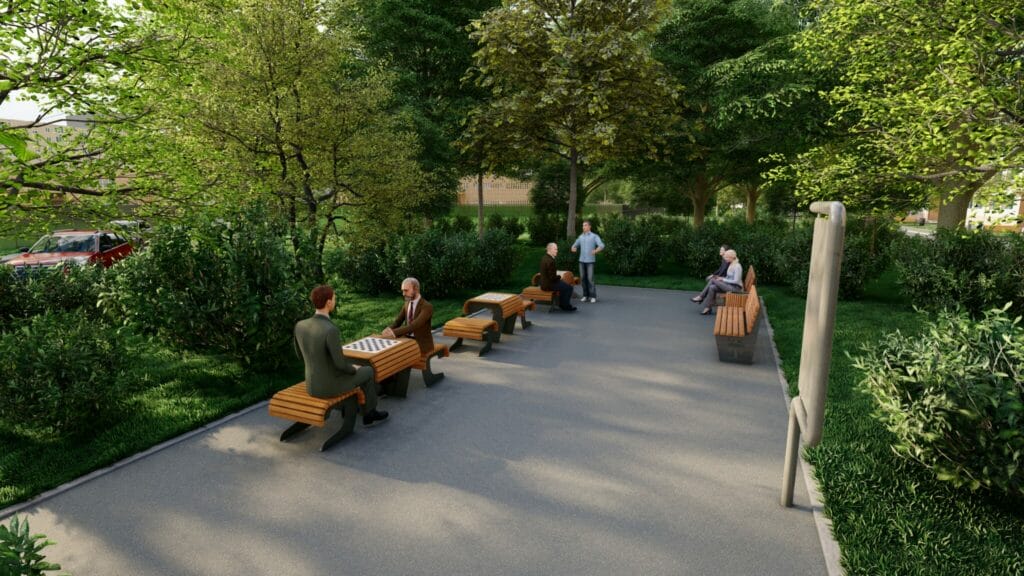 Существующий фонтан переоборудуют – станет «сухим». Для автомобилистов организуют новые парковочные места. В местах отдыха высадят деревья, разобьют цветники и установят современные опоры освещения.