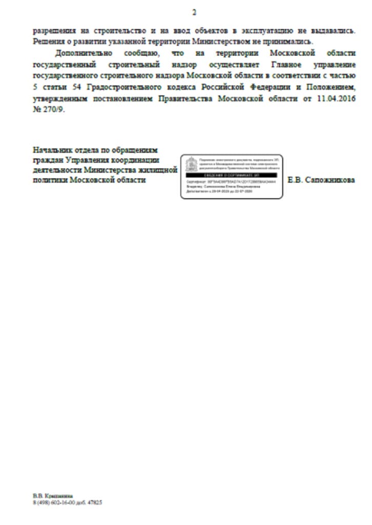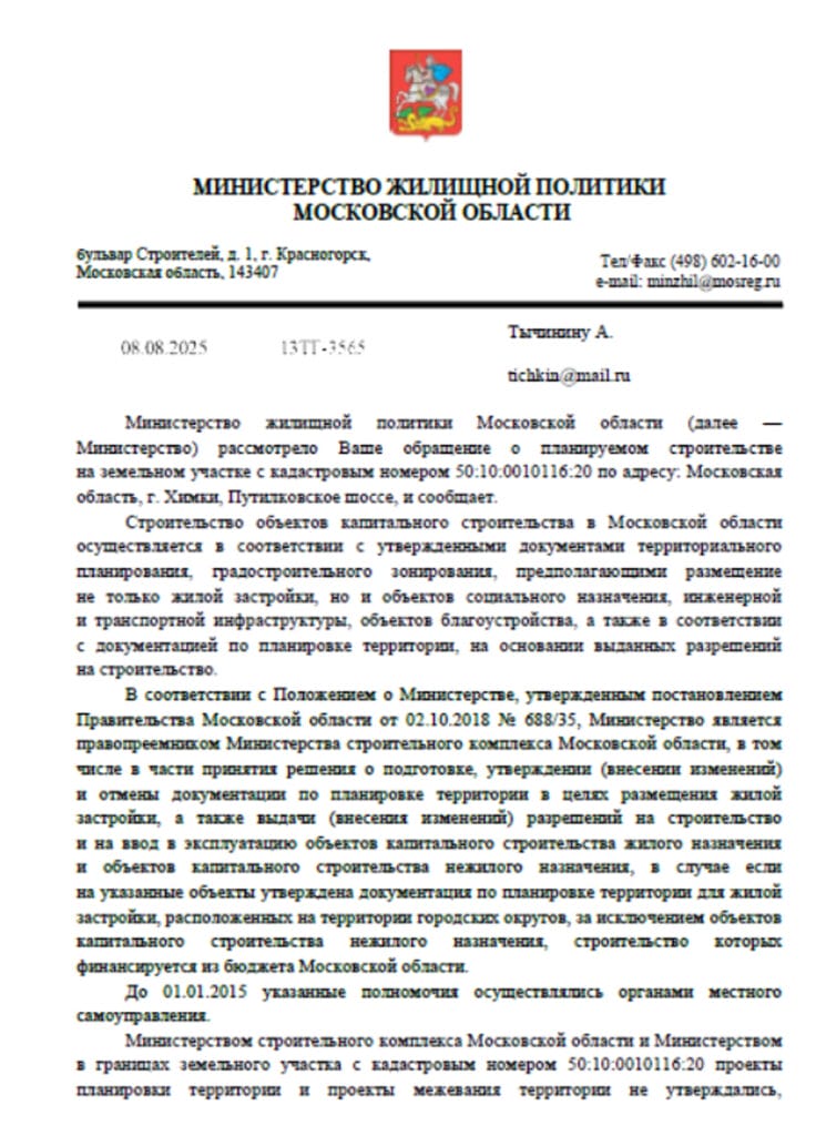 Будучи уверенными, что происходит самозахват неизвестными лесной территории, жители микрорайона срочно послали письмо в Министерство жилищной политики Московской области и получили однозначный ответ о том, что в границах данного участка с кадастровым номером 50:10:0010116:20, принадлежащего Химкам, Министерством строительного комплекса Московской области «проекты планировки территории и проекты межевания НЕ утверждались, разрешение на строительство и ввод объектов НЕ выдавалось». Ответ министерства свежий, датирован 8 августа 2025 года.