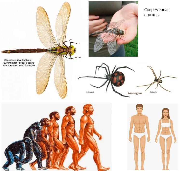 Совокупность половых различий является мерой эволюционной дистанции между полами. При этом направление полового диморфизма (от женской формы к мужской) показывает направление эволюционных изменений, служит «вектором эволюции». Например, у большинства позвоночных самцы крупнее самок. Это означает, что эволюция этой группы животных идет по пути постепенного увеличения средних размеров тела. У насекомых ситуация часто обратная – самки больше самцов. Значит, эволюция этих видов идет по пути уменьшения общих размеров (Рис. 2). У моногамных видов половой диморфизм меньше, чем у полигамов. Например, половой диморфизм (различия в размерах, окрасе оперения) у лебедей почти отсутствует.