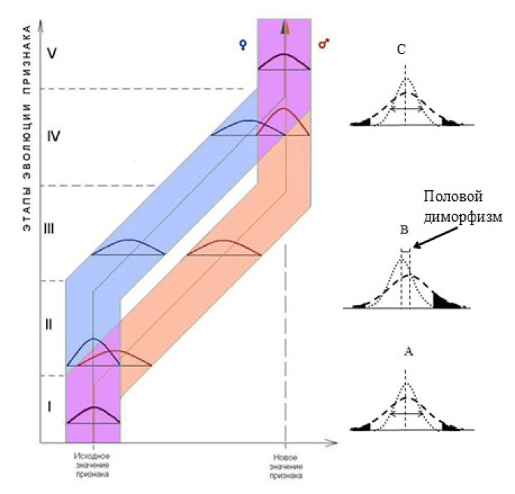 При изменении условий среды, женский пол покидает зоны отбора и дискомфорта, и сохраняет спектр прошлых генотипов. Мужской пол остается в опасных зонах и подвергается действию отбора. Сначала у него увеличивается дисперсия признака, поскольку для отбора необходимо разнообразие. Затем под давлением среды начинает меняться и среднее значение признака (рис. 1В). При этом он получает новую экологическую информацию, которая сохраняется в следующих поколениях и не попадает к женскому полу (передается от отцов к сыновьям). По теории это нужно для проверки новой информации. В этот период эволюции, в популяции появляется и растет половой диморфизм по данному признаку (стадия II).