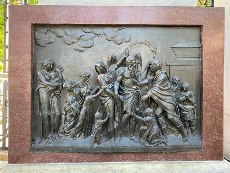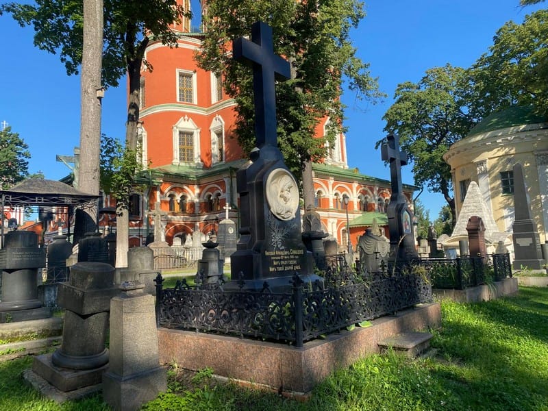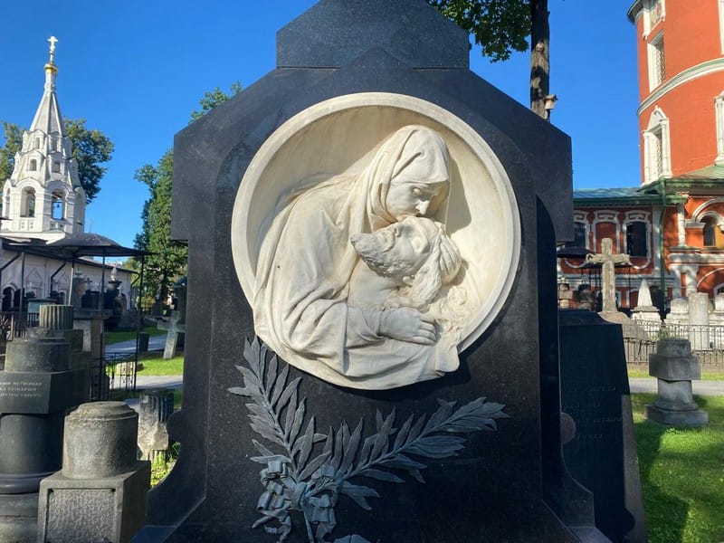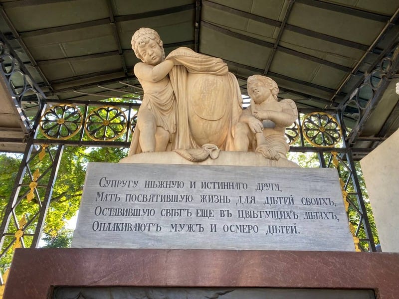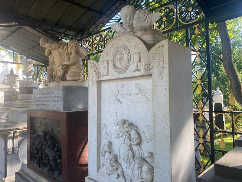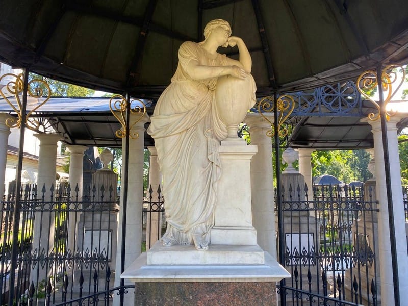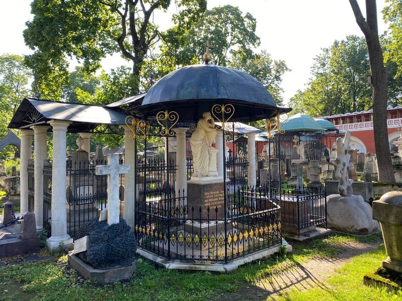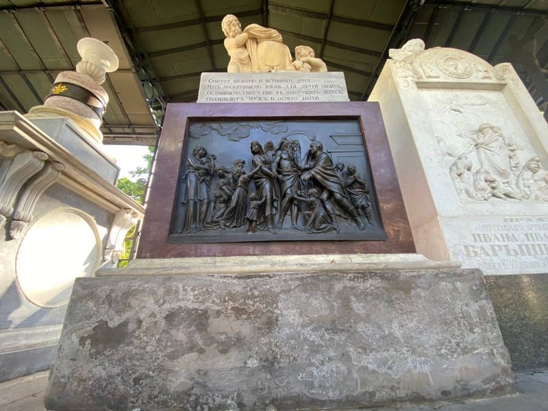 Одним из ярких образцов надгробных сооружений начала XIX века стало захоронение Яковлевых и Барышниковых. Под металлической сенью с ограждением находится могила Елизаветы Барышниковой. Представительница знатного дворянского рода Яковлевых, она имела благородное происхождение. Ее дед Савва Яковлевич Яковлев занимал пост коллежского асессора и был успешным промышленником с огромным состоянием. Судьба Елизаветы оказалась трагической. Выйдя замуж за состоятельного дворянина Ивана Барышникова, она подарила ему 13 детей. Однако в возрасте 34 лет, спустя всего полгода после рождения последнего ребенка, она скончалась. Опустошенный потерей супруг поставил над ее могилой надгробный памятник на высоком постаменте из полированного кварца, увенчанный мраморной скульптурной группой из двух фигур крылатых путти с траурной урной. Особую ценность представляет горельеф из латуни на западной стороне постамента – творение выдающегося скульптора-монументалиста Василия Демут-Малиновского. Скульптурная композиция запечатлела душераздирающую сцену прощания: древнегреческий бог Хронос уносит молодую женщину в загробный мир, а она, оборачиваясь, видит, как за ее руки и одежды цепляются осиротевшие дети.