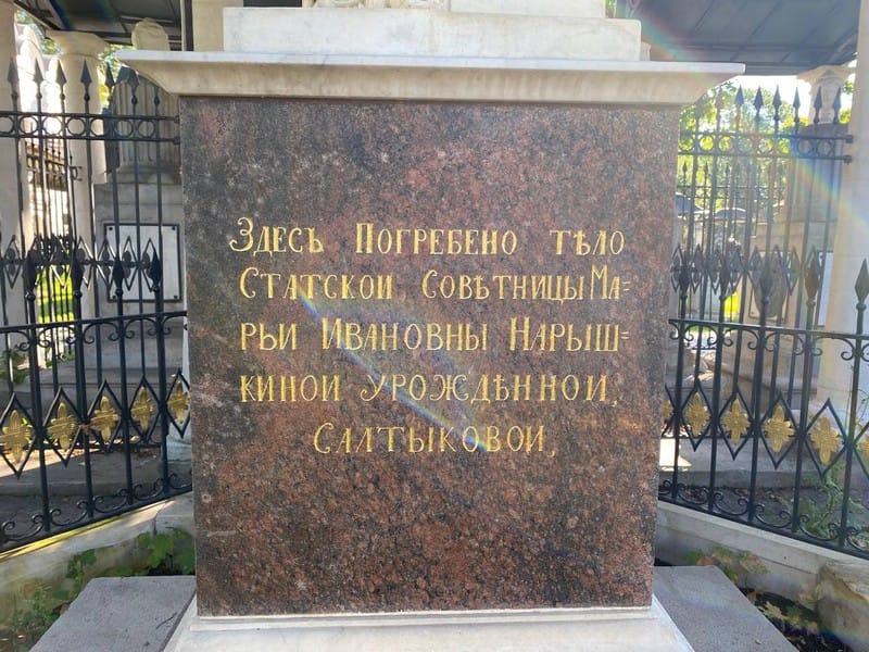 Еще один ценный образец монументальной скульптуры можно увидеть в западной части некрополя Донского монастыря. Под сенью с завершением в форме купола, поддерживаемого восемью опорными столбами, расположился надгробный памятник захоронения Марьи Нарышкиной – супруги статского советника и литератора Семёна Нарышкина. Памятник из белого мрамора представляет собой скульптуру в виде женской фигуры, облокотившейся левой рукой на погребальную урну. Плакальщица – молодая женщина, одетая в длинный, до ступней, хитон, подвязанный поясом, а на ее левом плече закреплена накидка-палла, обвивающая все тело и наброшенная на урну. Купол сени увенчан позолоченным крестом. Работы по сохранению памятника были выполнены в 2022 году. Специалисты сделали новый фундамент и воссоздали кованые декоративные детали ограды и сени.