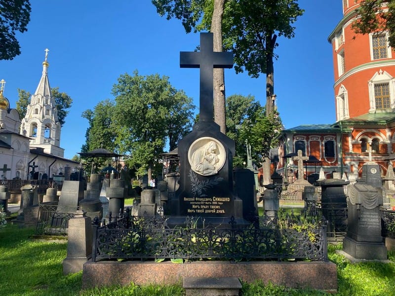 Также на территории некрополя Донского монастыря есть надгробие Николая Францевича Симашко – ротмистра гвардии и кавалериста. Его памятник, несомненно, привлекает внимание и говорит о том, что он занимал особое место в жизни общества. Надгробие Николая Францевича имеет высоту около пяти метров и представляет собой четырехконечный крест из габбро, установленный на стеле, в центральной части которой расположен мраморный медальон круглой формы с барельефным изображением Марии, оплакивающей Иисуса Христа («Пьета»). На постаменте нанесена мемориальная надпись сусальным золотом и клеймо изготовителя, выполненные в технике врезки. Граница участка имеет ограду геометрического цветочного орнамента. В 2021 году была выполнена реставрация надгробия по всем элементам памятника, воссоздан утраченный декоративный элемент – ветка, элементы ограды.