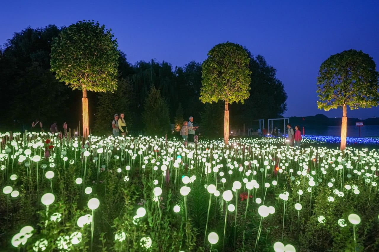 Для подсветки цветников установили более 83 тысяч декоративных шаров-«светлячков» высотой от 50 до 80 см, при солнечном свете они выглядят как одуванчики, покрытые белым пухом, и хорошо дополняют цветочные композиции.