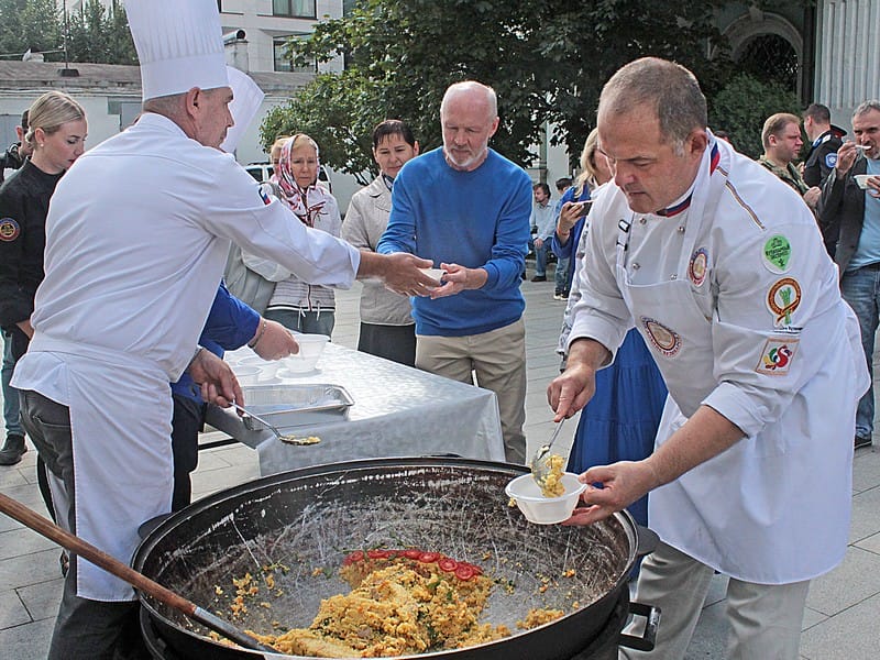 В некоторых регионах России на Яблочный Спас устраивали традиционные общие угощения: на улицу перед храмами выносили большие столы, куда ставили квас, яблоки и сладкую выпечку. Храм Святителя Николая в Заяицком тоже решил соблюсти славную традицию: всех гостей пригласили на праздничную трапезу. Для угощения шеф-поварами «Международного альянса кулинаров» была приготовлена «Каша Александра Невского» – историческое блюдо, рецепт которого был воссоздан по описаниям княжеского пира в честь победы в Невской битве. В приготовлении участвовали президент альянса кулинаров Валентин Лобачев, вице-президенты Горан Станисавлевич и Алексей Виноградов, а также Виктория Бредис.