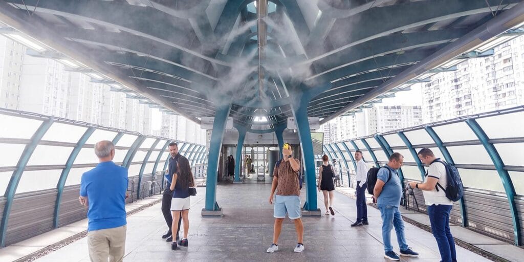 Длина системы составляет десять метров, ее смонтировали над наиболее людной частью платформы. Устройство включается один раз в 30 секунд. Разумеется, пассажиры могут ожидать прибытие поезда и вне зоны действия туманизатора. Одежда в любом случае сохраняется сухой, ведь размеры капель – пять-шесть микрон, что в 20 раз тоньше человеческого волоса.