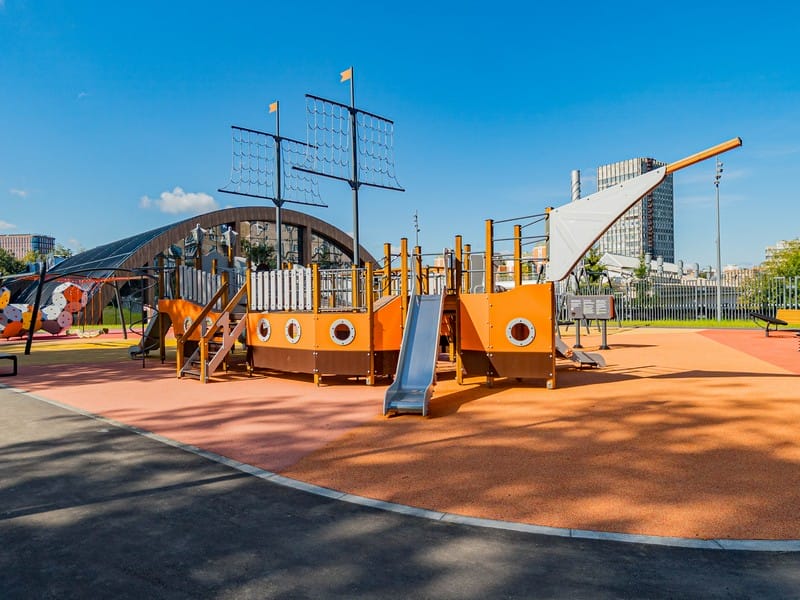 Также установлен игровой комплекс «Паруса», который выглядит как модель корабля. На нижнем уровне возможен обзор через иллюминаторы, а на верхней палубе есть мостики, лестницы, штурвал и горки разной высоты и формы.