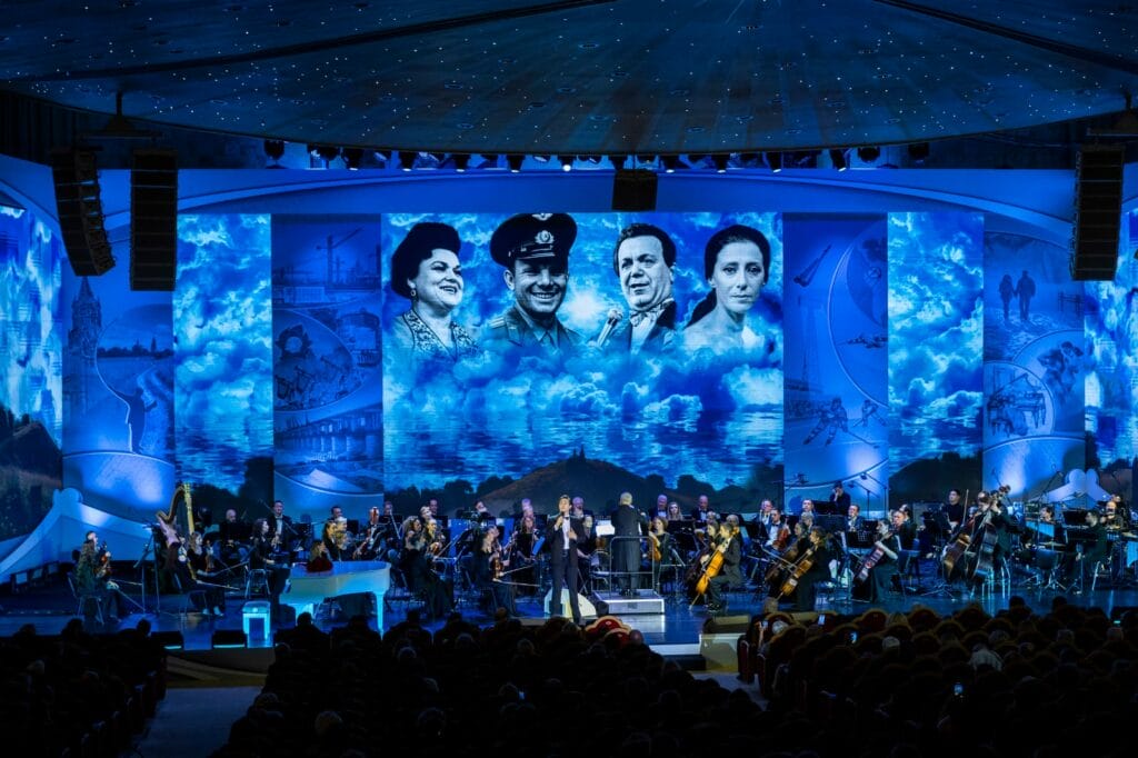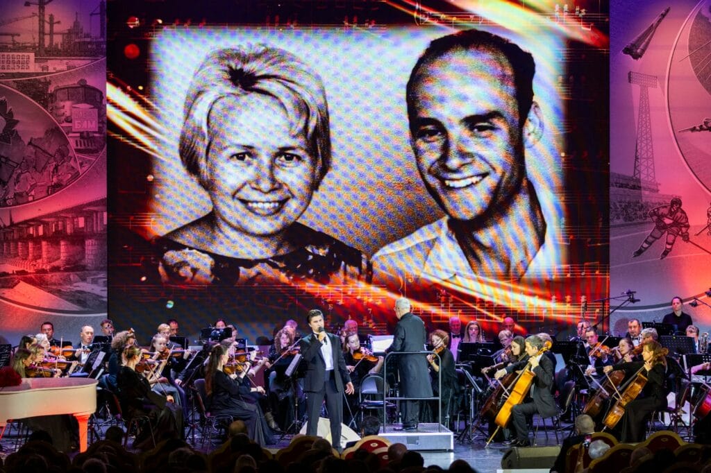 На экране промелькнули сотни фотографий замечательной семейной пары Пахмутовой и Добронравова, знаковых для них людей, их друзей. Эти снимки были сделаны в разные годы и в разных уголках страны – на Дальнем Востоке и в Сибири, на БАМе, Ангаре, Кузбассе, Магнитке, на космодромах, в научных центрах, в больницах, на строительных площадках, в концертных залах и у палаточных костров. Ладожская дорога жизни, период эвакуации, грандиозные стройки, города нашей славы, Беловежская пуща, ледовые баталии, концертные конкурсы, улыбающиеся космонавты перед стартом – все это не просто фон истории большой любви творческого тандема, но и реальные факты ежедневных сводок, которыми жил весь Советский Союз.