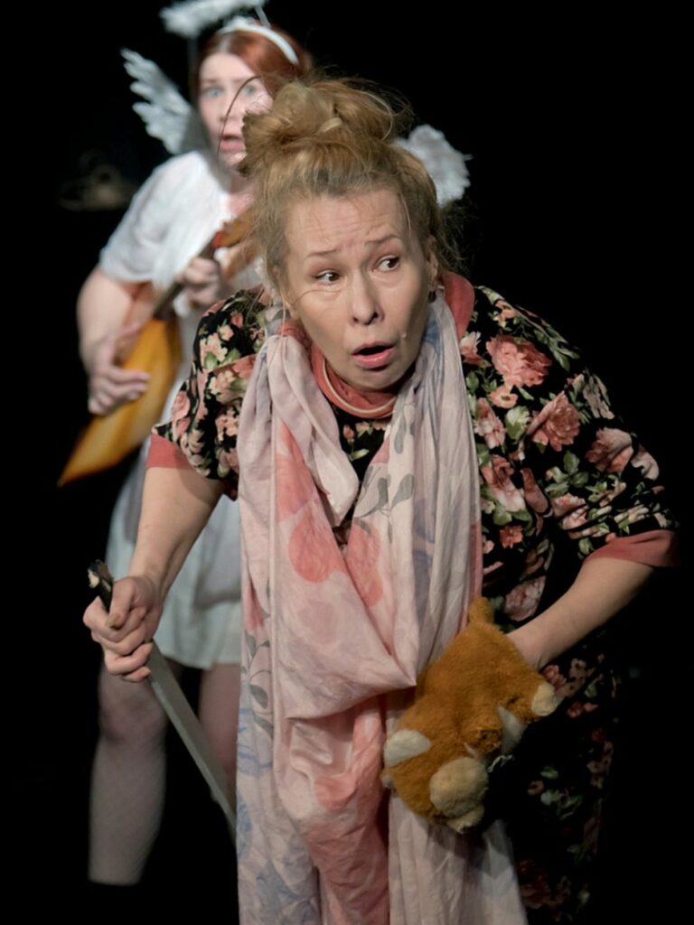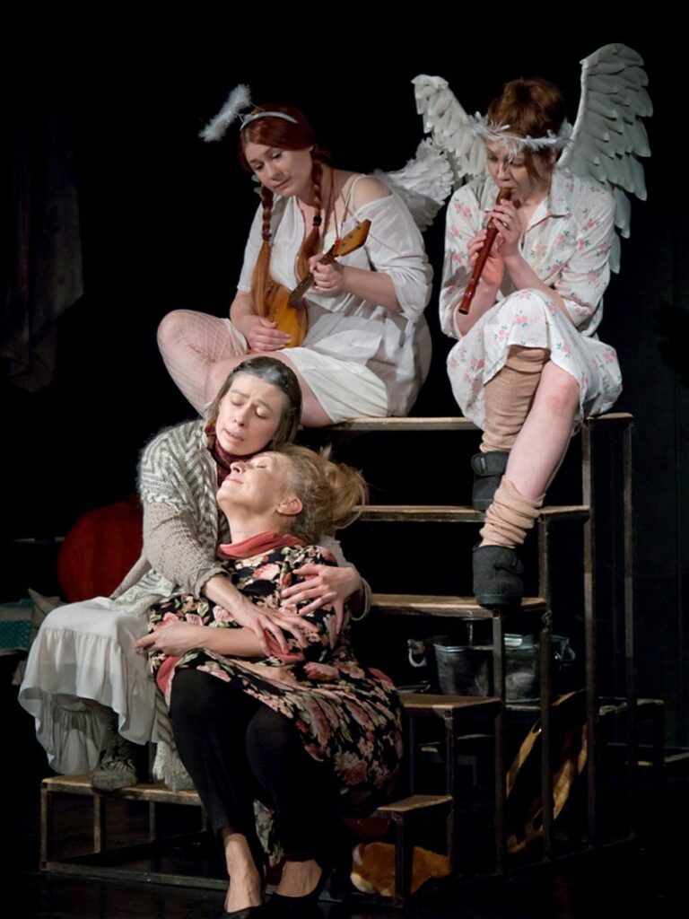 В постановке старушку-дочь играет заслуженная артистка РФ Ирина Богданова, а старушку-мать – Ким Кошева. Среди других персонажей – Молодой человек в исполнении Сергея Бесхлебнова и «Домашние ангелы» – артисты Анна Богдан, Виктория Закария, Пелагея Растопчина.