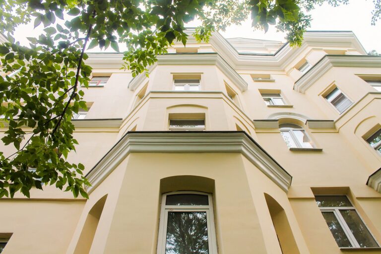 На объекте вначале промыли фасад, а затем отбили отслаивающиеся части штукатурного слоя. После подготовительных работ фасад окрасили, вернув ему исторические цвета «светлая слоновая кость» и «сигнальный белый».