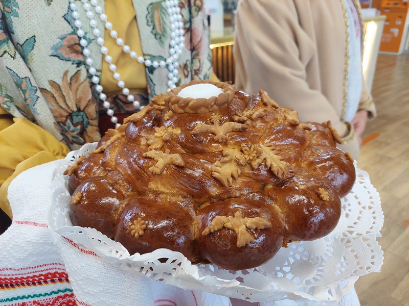 Впрочем, начнем с каравая. Именно он – главный участник обряда встречи с хлебом-солью. На вышитом рушнике пышный каравай из сдобного теста, с украшениями. И на макушке – небольшая солонка. Отламываешь кусок мягкого теста, макаешь в соль, вкусно!