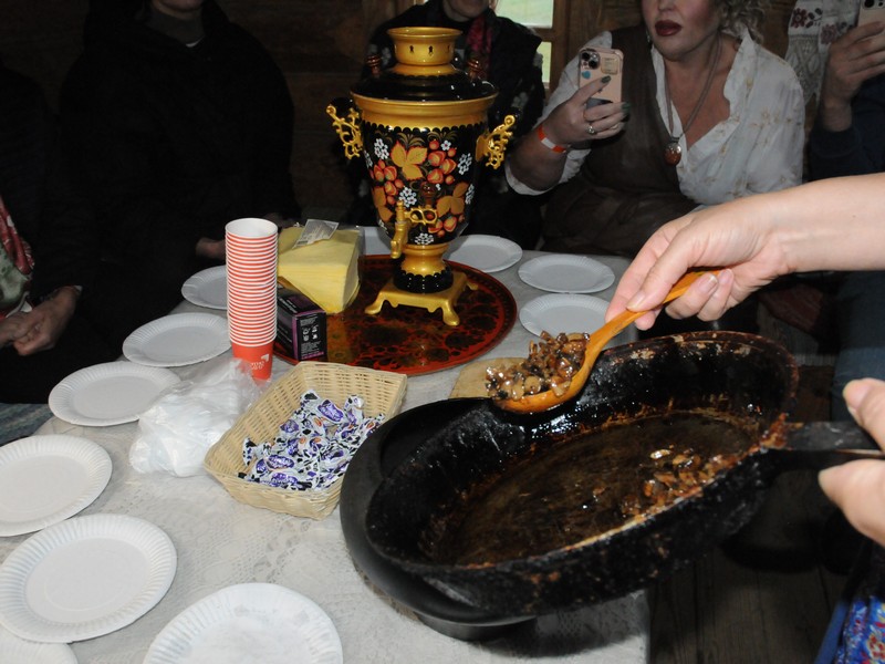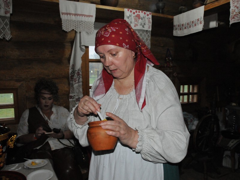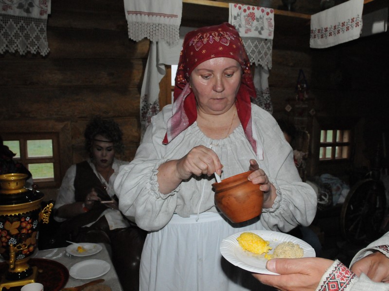 Хозяйка избы Елена Жолудова в русской домотканой рубахе и «сороке» – головном уборе замужней женщины уже все приготовила к нашему приходу. Печь протоплена, с горячими углями. На столе горячий самовар. И в печи, по бокам, стоят горшочки с уже готовой кашей. Ну а главную будем сами варить, точнее, томить.