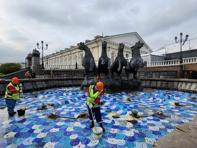 «Специальным моющим средством очистили гранитные поверхности, цветную мозаику и бронзовые фигуры персонажей известных русских сказок. Отдельно тщательно промыли скульптуры коней главного фонтана «Гейзер» и фонтан «Часы мира». Декоративные детали очистили вручную мягкими кистями с применением специального средства, затем промыли водой под давлением», — рассказали в пресс-службе Комплекса городского хозяйства Москвы.