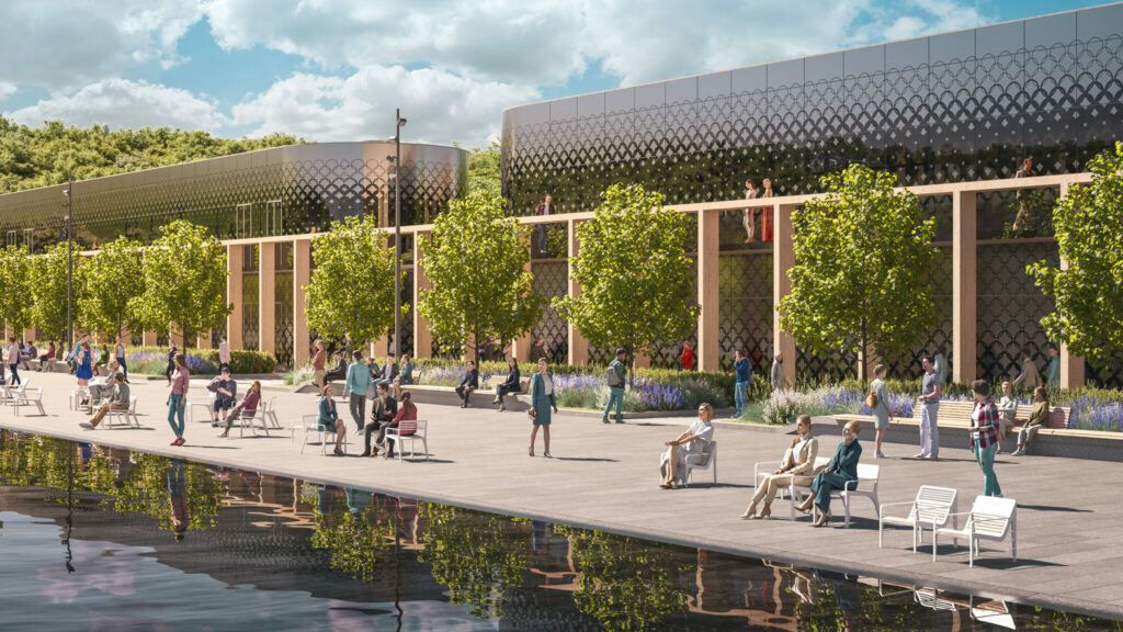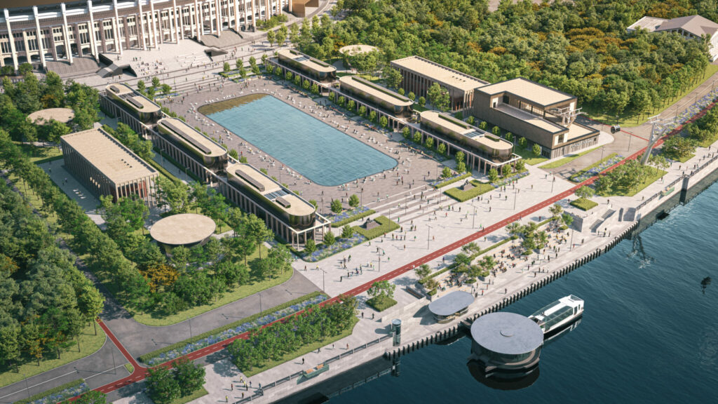 «Восемь павильонов находятся между аллеями деревьев вдоль центральной площади. Два из них в зимний период могут стать частью инфраструктуры катка – в них будет возможность разместить прокат, камеры хранения и раздевалки, а летом проводить различные мероприятия. Павильоны будут двухэтажными, со скругленными остекленными фасадами, их окружат колоннады, за счет которых на уровне первого этажа образуется пешеходная галерея, на уровне второго – терраса», – отметил Пётр Бирюков.
