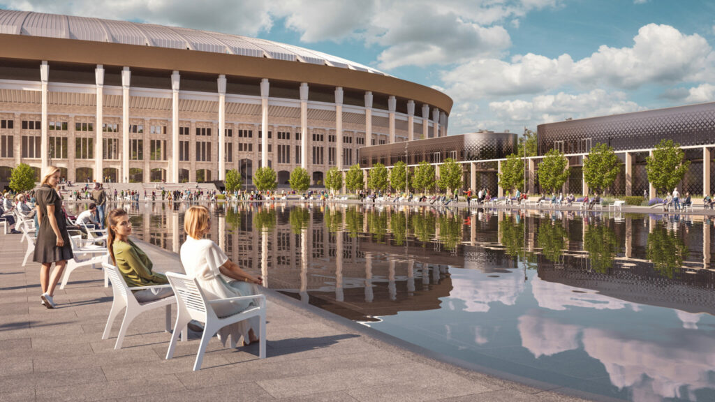 Во время работ в «Лужниках» отремонтируют покрытие дорожек, установят новые опоры освещения с энергоэффективными светильниками. На центральной площади появится фонтан с большим зеркалом водной глади, зимой там и на прилегающих боковых аллеях планируется заливать каток.