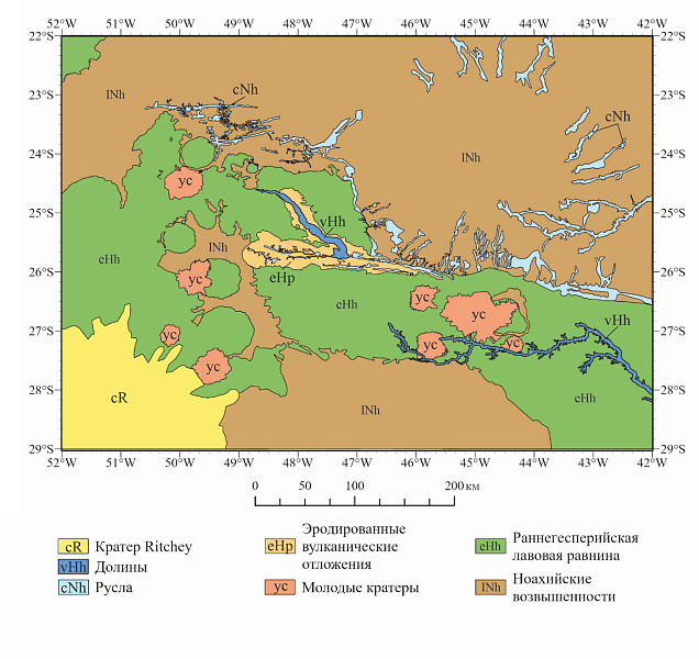 Ученые выяснили, что самым древним подразделением на данной территории являются возвышенности ноахийского возраста (до 3,7 млрд лет) с неровной поверхностью, на севере изъеденной небольшими флювиальными руслами. Формирование сети русел могло происходить в несколько этапов за счет таяния поверхностного или подповерхностного льда из-за эпизодических локальных потеплений, вызванных метеоритными ударами или вулканизмом.