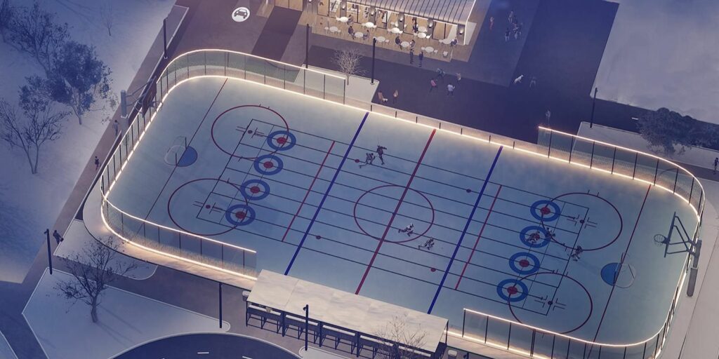 Объект включает хоккейную коробку площадью 1,8 тысячи квадратных метров. Для нее подготовлено основание, смонтирован борт из монолитного поликарбоната, имеется светодинамическая подсветка. Установлена моноблочная холодильная установка, зимой здесь будет можно кататься на коньках и проводить хоккейные матчи. А летом коробку переоборудуют для футбола и баскетбола.