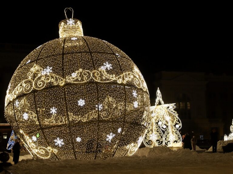 Диаметр шара — 17 метров, вес порядка 35 тонн. Новогодняя конструкция состоит из 176 тысяч светодиодов.