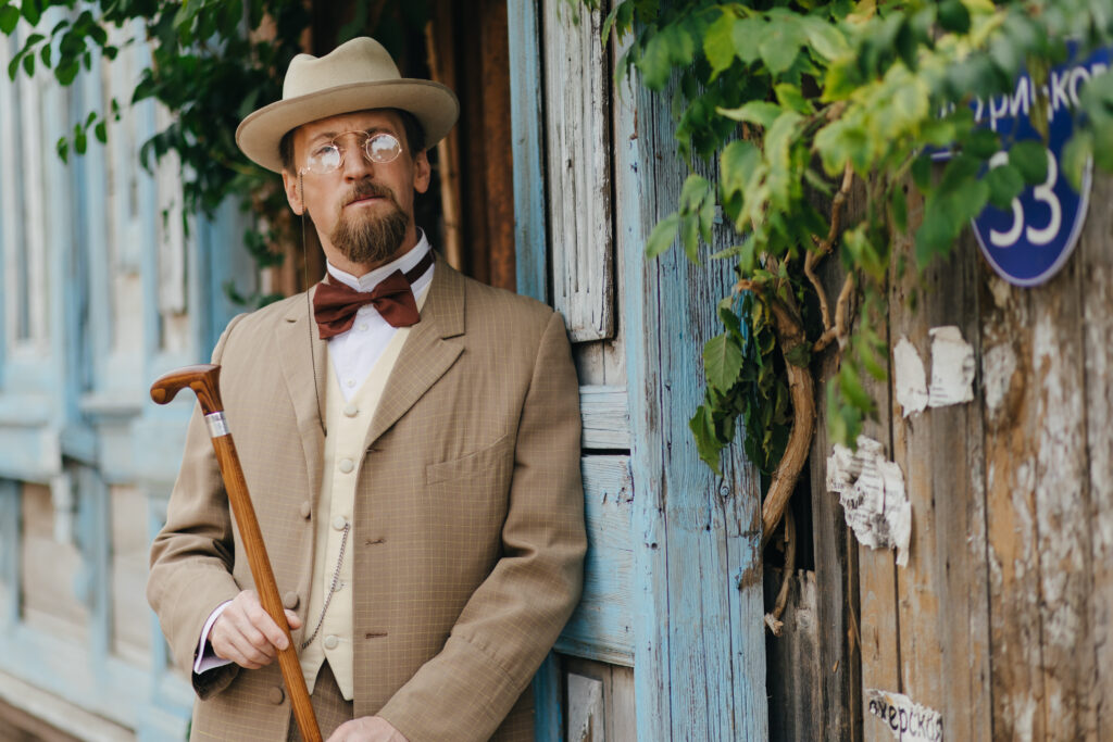 В кадре Деревянко и Некрасов примерили знаменитую чеховскую бородку, винтажный костюм, антикварное пенсне, серебряные часы 1895 года и аналог трости Чехова, которую Антон Павлович использовал в жизни. Художники также заказывали и фактурили медицинский прибор фонендоскоп, который напомнит зрителям о первой профессии драматурга.
