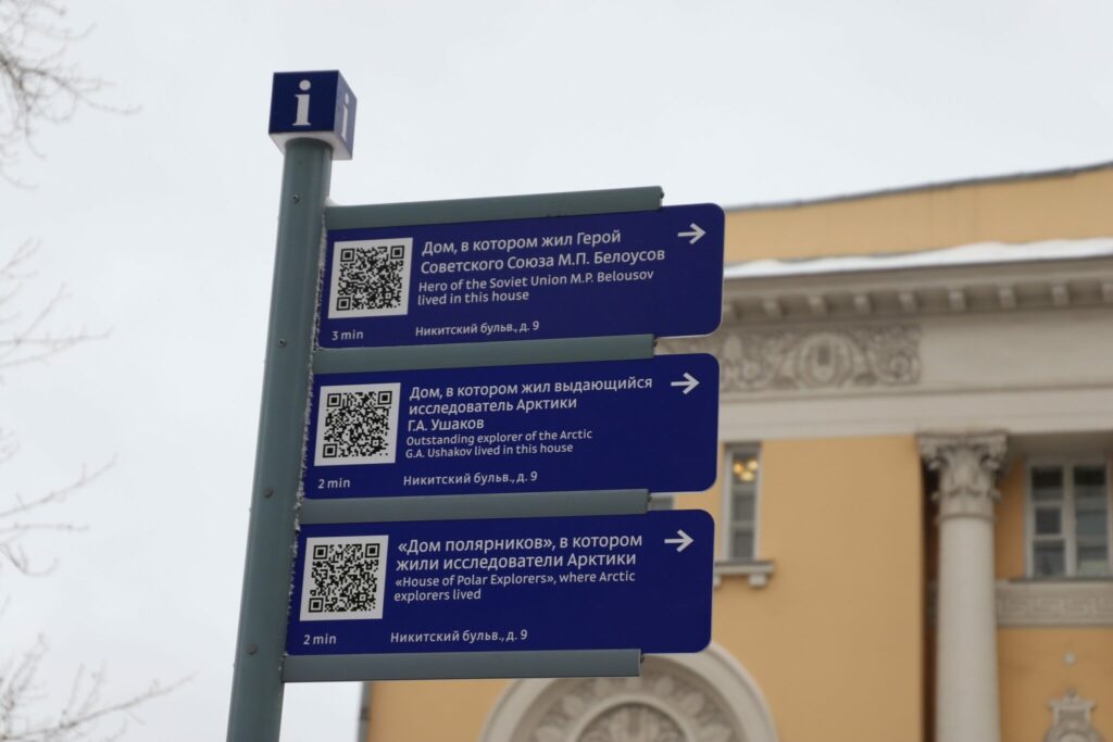 Навигационные элементы в Москве соответствуют разработанному стандарту. Городские указатели имеют QR-коды, которые содержат информацию о достопримечательностях.