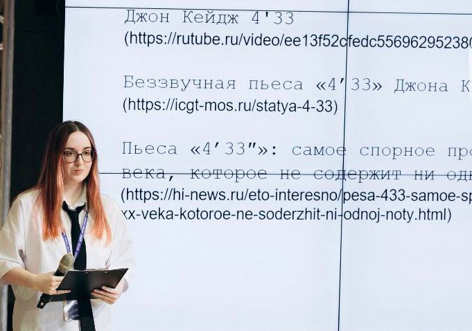 Как рассказала учитель русского языка и литературы школы №2120 Татьяной Чабанец, для отборочного этапа выпускница выбрала тему «Великие женщины России», а для финала – знаменитую пьесу композитора Джона Кейджа «4’33»