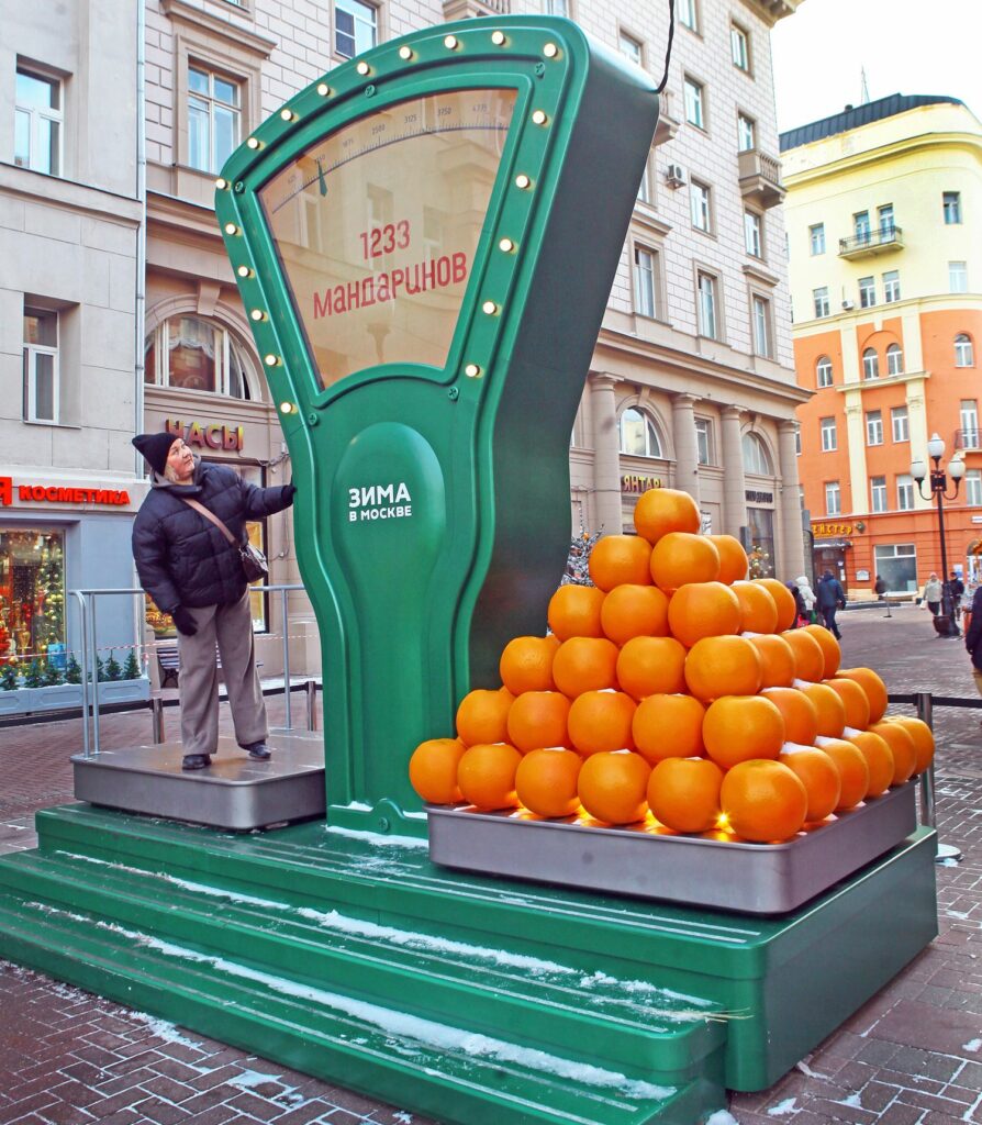 Но самое необычное ждет вас на старой улице Арбат, где раскинулось мандариновое море, нет, даже океан, это настоящее мандариновое безумие! Мандариновые весы на Арбате, пожалуй, одна из самых необычных новогодних точек в этом сезоне, ведь узнавать свой вес в цитрусовых намного приятнее, чем в килограммах (особенно после обильного новогоднего застолья). К тому же цифра сообщается в мандаринках, так что истину никто не узнает. Хотите взвеситься – учитывайте огромную очередь из желающих.