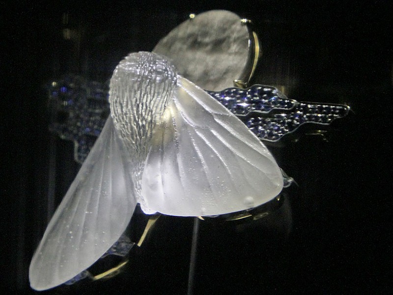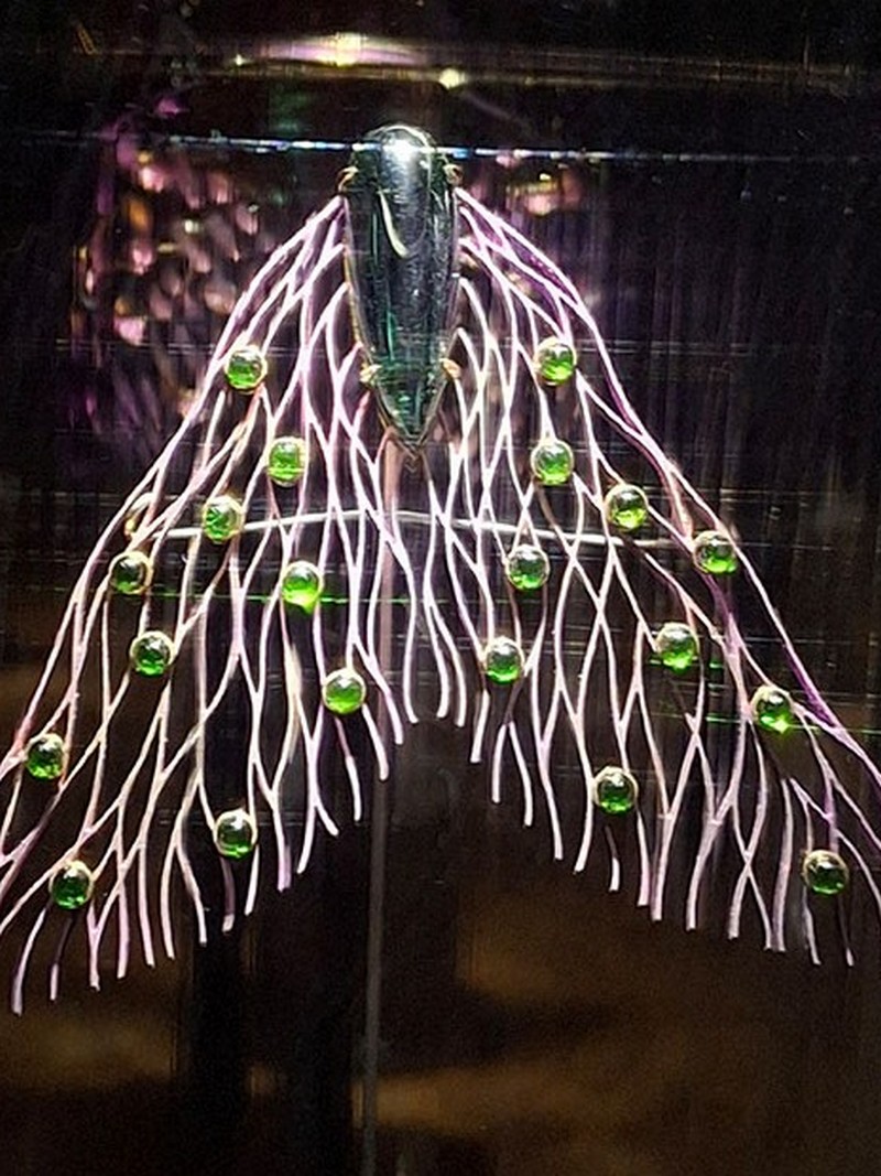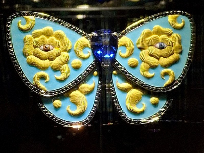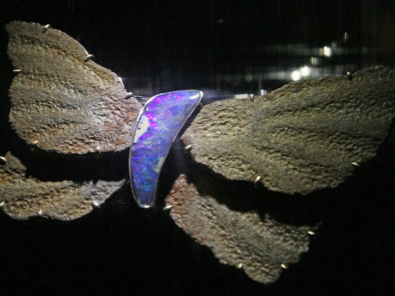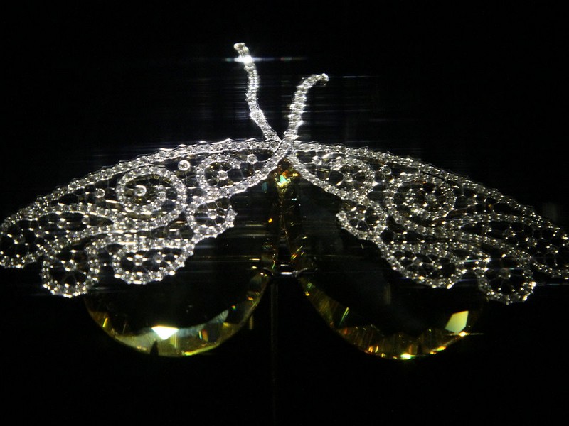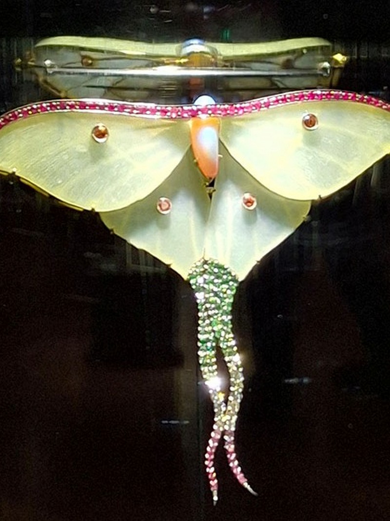Уникальность выставки и в логистике: посетитель попадает в затемненное пространство с вертикальными витринами, внутри которых «слетелись» на свет выдающиеся брошки.