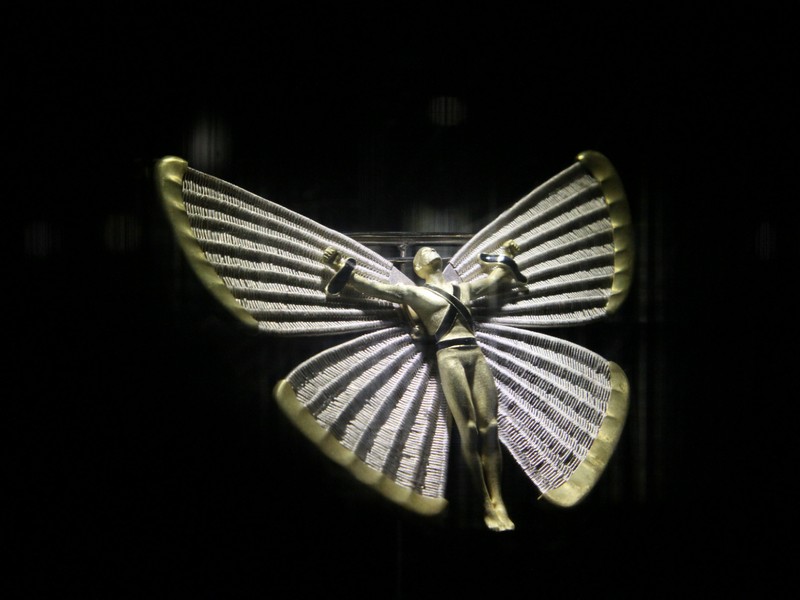 Экспозиция, включающая 54 уникальных ювелирных изделия, разделена на три части: «Бабочки. Затмение», «На свет из темноты» и «Цель». Центральным образом стала брошь «Имаго» в виде фигурки человека из золота с серебряными крыльями. Украшение ассоциируется с обновлением человеческого сознания и стремлением к свету. Горячей эмалью на брошь нанесены мельчайшие изумрудно-зеленые детали – так прикреплены крылья, что напоминает древнегреческий миф об Икаре.